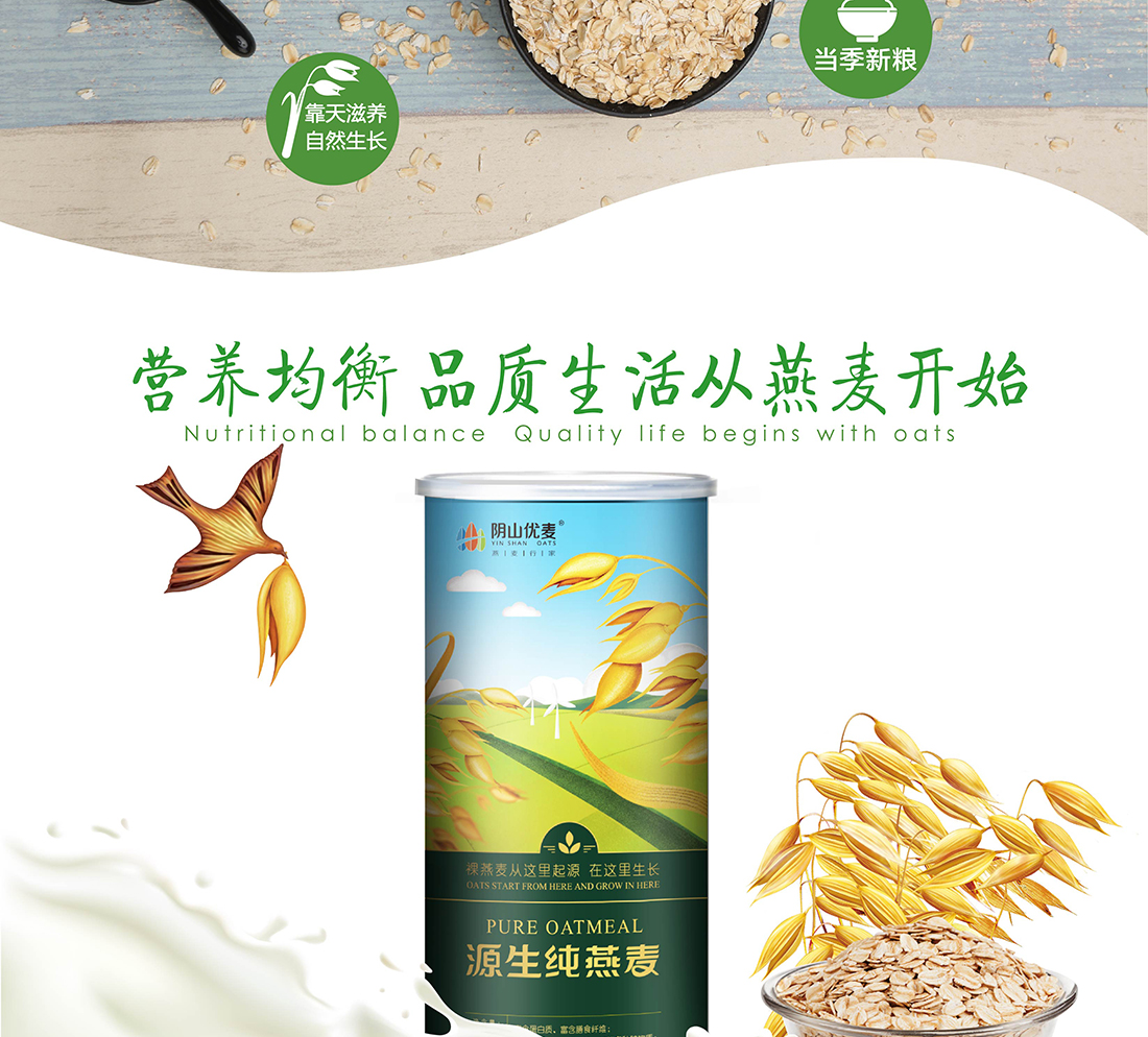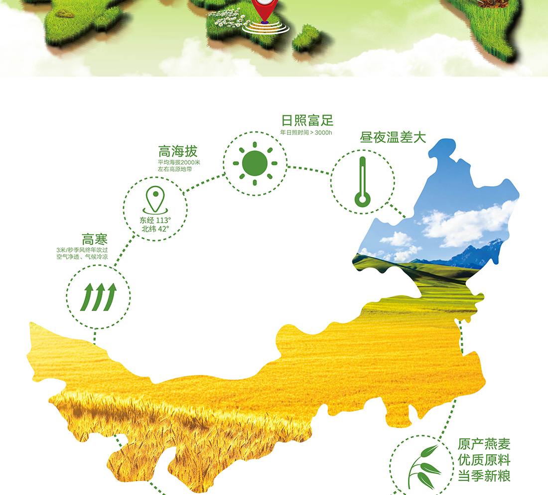 內(nèi)蒙古,世界裸燕麥起源地之一;陰山源生燕麥在此初生滿足生長規(guī)律一切所需,高寒、高海拔、日照充足;遵循自然法則,靠天滋養(yǎng),自然生長