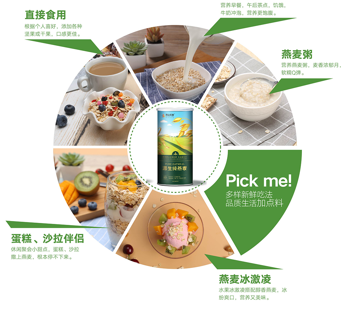 多樣吃法:直接食用、沖泡牛奶、燕麥粥、蛋糕、沙拉伴侶、燕麥冰激凌